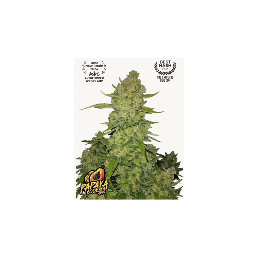 Descripción del cogollo La Papaya Cookies Auto™ produce cogollos compactos de color verde claro que muestran hermosas tonalidades de púrpura claro, acompañadas de pelos de color naranja papaya que les confieren un aspecto realmente delicado. Esta potencia de tricomas produce una resina dulce y cremosa con un aroma que recuerda a un granizado de frutas tropicales, acompañada de un fondo de masa de galleta que hace que el hachís sea de lo más sabroso. Una variedad genuinamente aromática para los cazadores de sabores y productores de hachís más exigentes, ya que sus flores no solo son extremadamente escarchadas, sino que también ofrecen una gran variedad de sabores.Efecto Con una ligera dominancia Sativa, la Papaya Cookies Auto™ produce un efecto general edificante y alegre, que te llena de pensamientos positivos y claridad mental para afrontar los retos cotidianos con una amplia sonrisa. El impacto energizante va acompañado de una fuerte relajación corporal, proporcionando un alivio eficaz de los dolores corporales sin inducir al bloqueo en el sofá, permitiéndote funcionar y disfrutar del efecto de bienestar durante todo el día.Aspecto de la planta Esta cepa se desarrolla asombrosamente bien estructurada y presume de un crecimiento realmente rápido, mostrándote todo su potencial con facilidad. La Papaya Cookies Auto™ alcanza hasta 120 cm de altura, con un espaciado internodal ideal para el entrenamiento de la planta y cogollos supergordos que apestan a fruta exótica ya en la 5.ª semana. Un cultivo imprescindible para aquellos que quieran maximizar los rendimientos lo antes posible sin sacrificar la calidad.