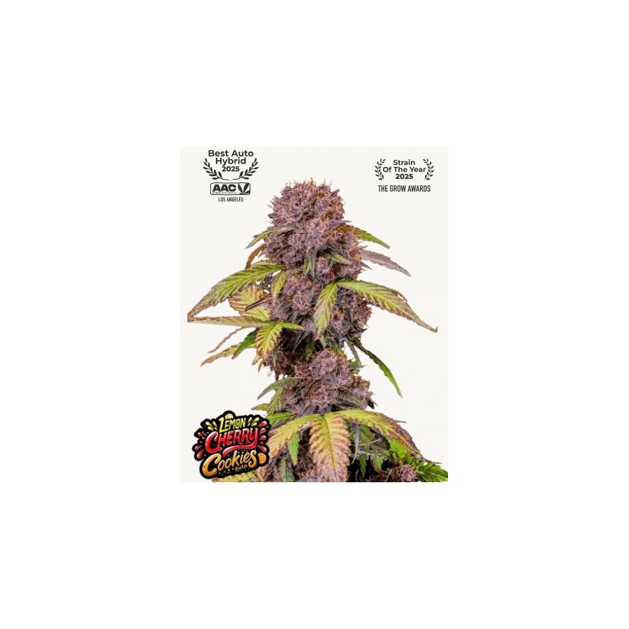 Descripción del cogollo Espera cogollos densos y de olor dulce. La Lemon Cherry Cookies Auto™ produce cogollos morados con largos pelos vibrantes de color naranja oscuro que sobresalen de los cálices gordos y escarchados. Las flores púrpuras duras como rocas terminan con una gruesa capa de resina en el momento de la cosecha y apestan a terpenos azucarados y agridulces con matices ligeramente funky.Efecto La potencia de la Lemon Cherry Cookies Auto™ muestra las capacidades de las autoflorecientes modernas. Con un contenido de THC de hasta el 28,5%, esta variedad induce un potente efecto relajante, combinado con un alegre subidón cerebral que te deja completamente relajado y libre de tensiones. A medida que fumas, la potente influencia Indica se hace más evidente, y sus efectos energizantes pasan a un duradero subidón que relaja de la cabeza a los pies y te deja feliz con una sensación de energía creativa. El efecto ideal para los consumidores que aprecian una fumada bien equilibrada con tendencia Indica.Aspecto de la planta La Lemon Cherry Cookies Auto™ se desarrolla con una estructura compacta, ostentando el clásico aspecto de Indica, con hojas anchas en abanico y un espaciado internodal relativamente corto. Gracias a su herencia genética, esta cepa es relativamente fácil de cultivar y rara vez requiere apoyo, ya que las ramas soportan sin esfuerzo el peso de las colas extremadamente gordas. Durante las últimas fases del ciclo de crecimiento, espera hermosos colores, ya que los matices verdes se transforman gradualmente en tonos claros y oscuros de púrpura y las hojas en abanico se desvanecen en una coloración rosa oscura.