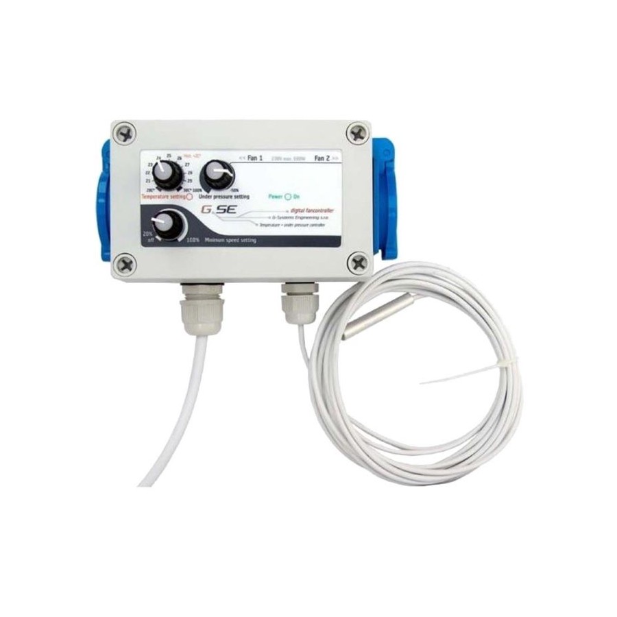 El fan controlador digital regula la temperatura en los cuartos de cultivo con el flujo del aire mediante la regulación de extractores y intractores. El controlador mantiene la temperatura preestablecida y bajo presión constante para evitar que olores se escapen. Se puede controlar fácilmente, ajustando la temperatura requerida, la velocidad mínima y la presión de su habitación en solo tres butones.